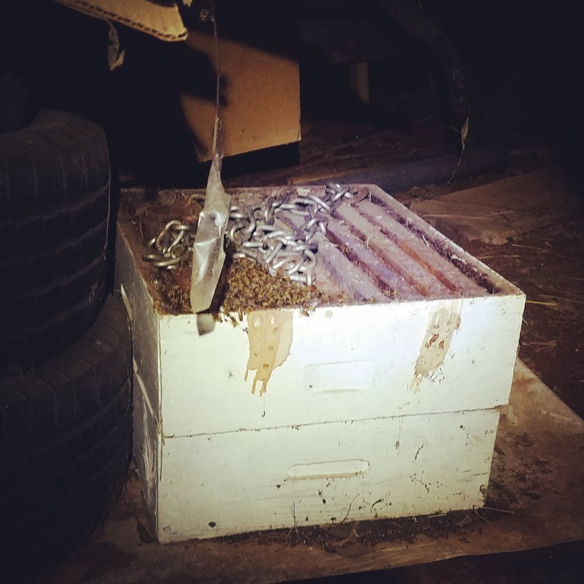 Then a bee stung my knee, and the hive activity kicked-up a notch. Slowly moving the chain was not an option. I grabbed what appeared to be the other end of the chain and slung it on the ground. Buzzing amplified round my bonnet and they crawled on my arms and pants. “Now put the cover liner on and leave them until tomorrow .” I ducked away to clear the trailing bees. After a minute or so, I went back to them, put the cover on the new hive and ran.