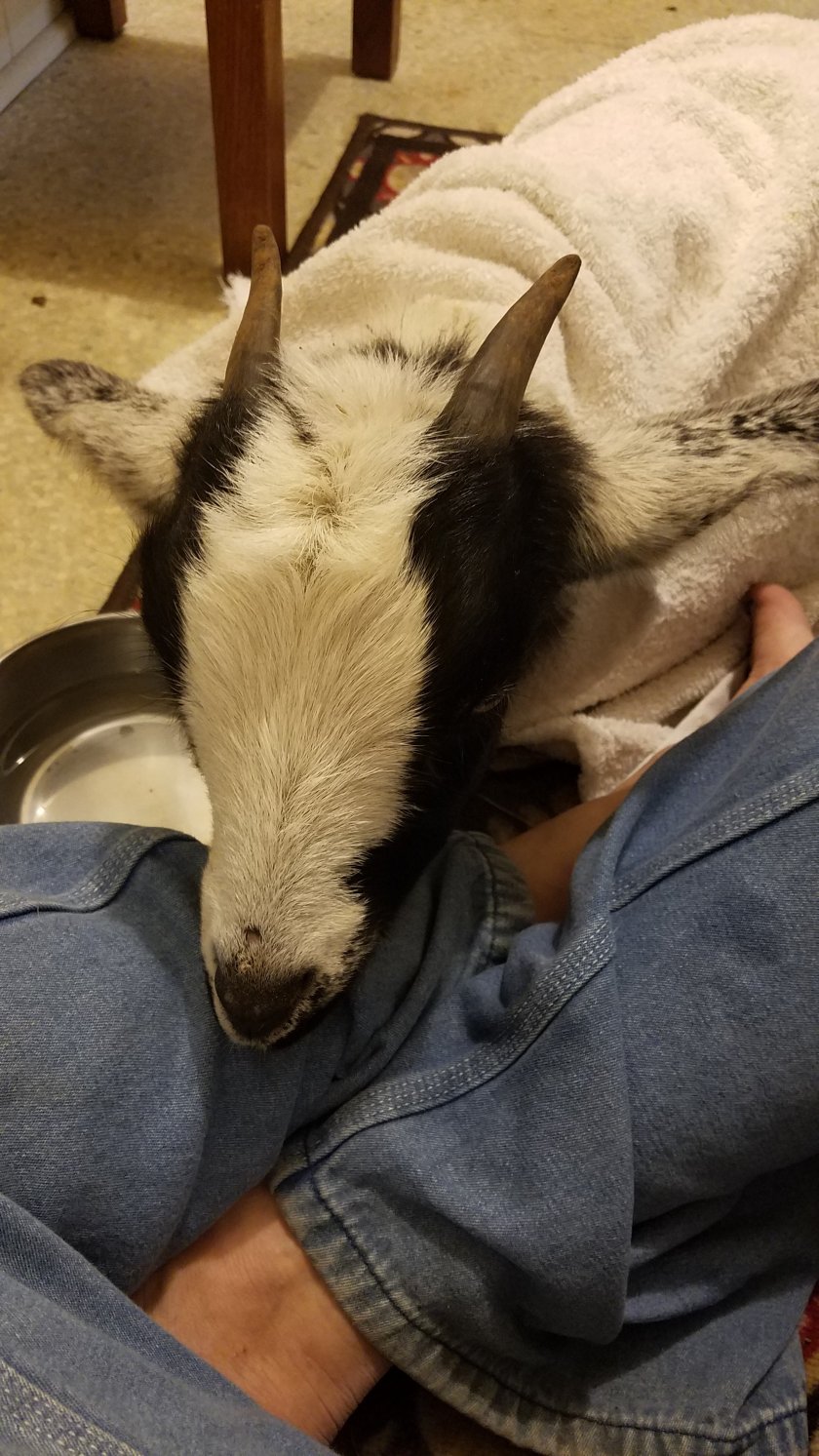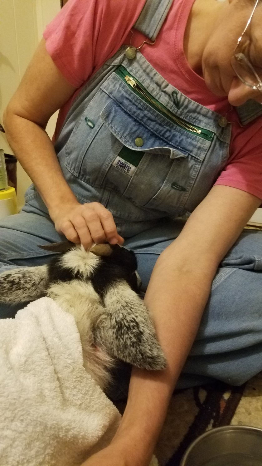 Most husbands walk through the door after work expecting to be greeted by the sounds of a spouse, dog(s), or kids. My husband, on occasion has been greeted by the sound of a goat kid, screaming in discomfort. Tonight was that night. I discovered one of our 9 month old female goats, named Foxy Brown standing in the pasture, in shock and bleeding from the neck. Hastily, I lifted her to the wheelbarrow and took her to the house. Although she only weighs about 50 pounds, she’s sturdy enough that I did not want to haul her from the barn to the house if I could avoid it.