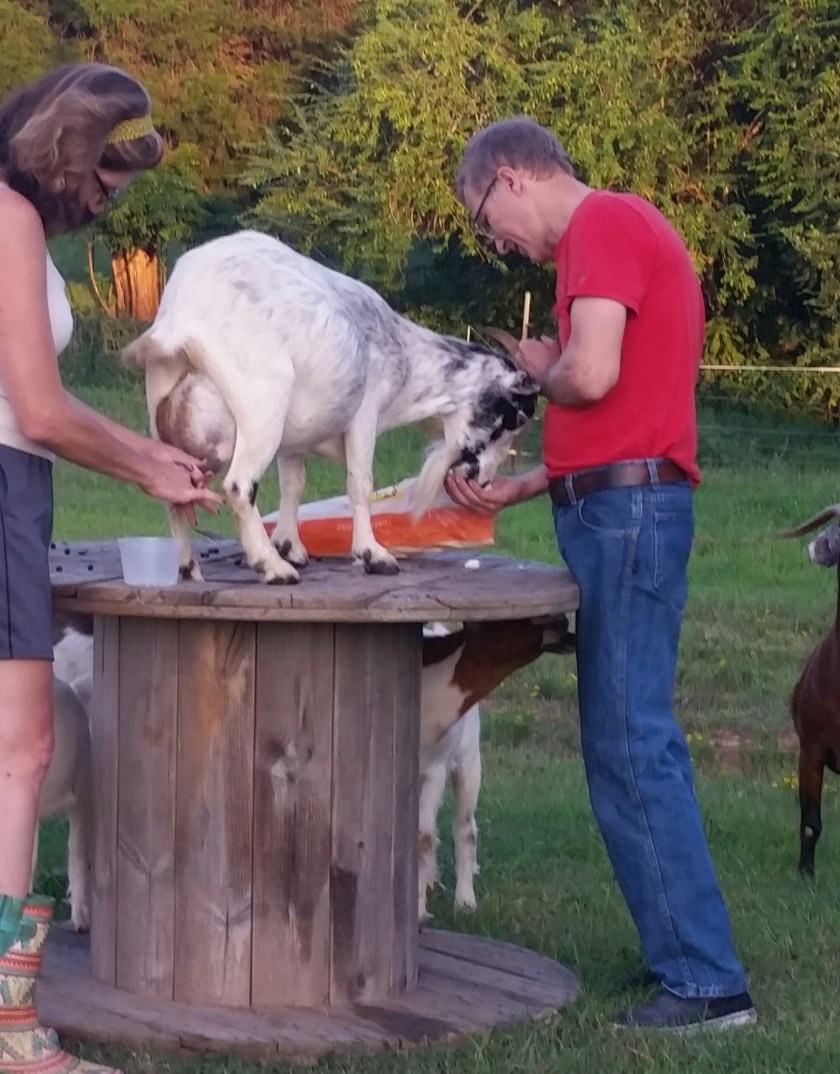 Finally, we convinced him to go outside and he did hold the goat, for about 30 seconds. Then, Lisa took over and we laughed as 3 goats tried to eat snacks and I milked out another 1/2 quart of milk.