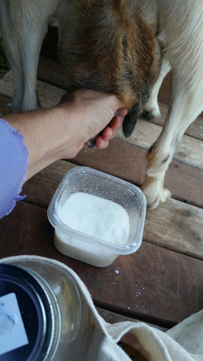 A few weeks later, my friend Joci came to visit the goats, and I realized that Faith’s udder was once again filled, because the buckling was not nursing from both sides. I looked at her and said, “Here, hold my goat.” I grabbed the nanny, and together we lifted her to the crate. I repeated the process of milking that smelly gray and white horned animal. This time, she patiently stood while this stranger held her horns. With her back leg, she scratched my wrist and her own udder… which required a quick spray of Blue-Kote… the same magical spray that I’ve used on myself!