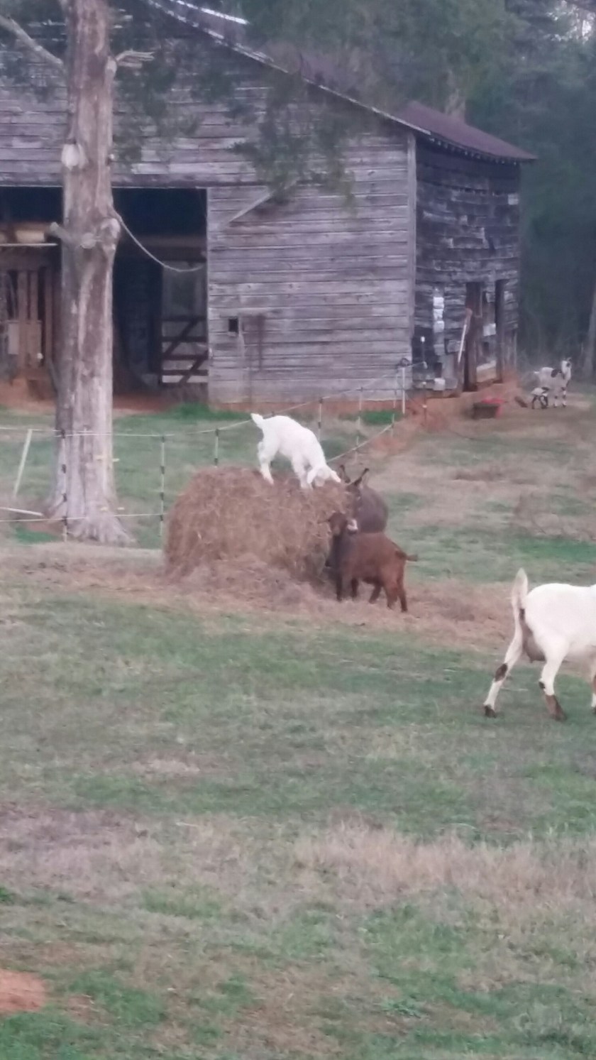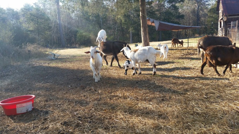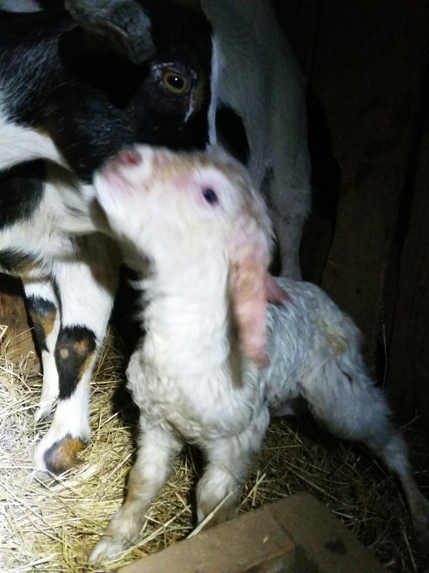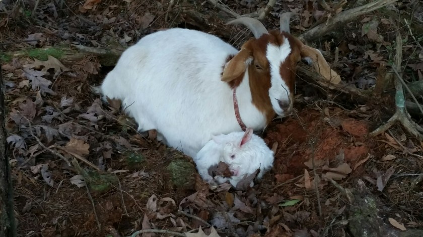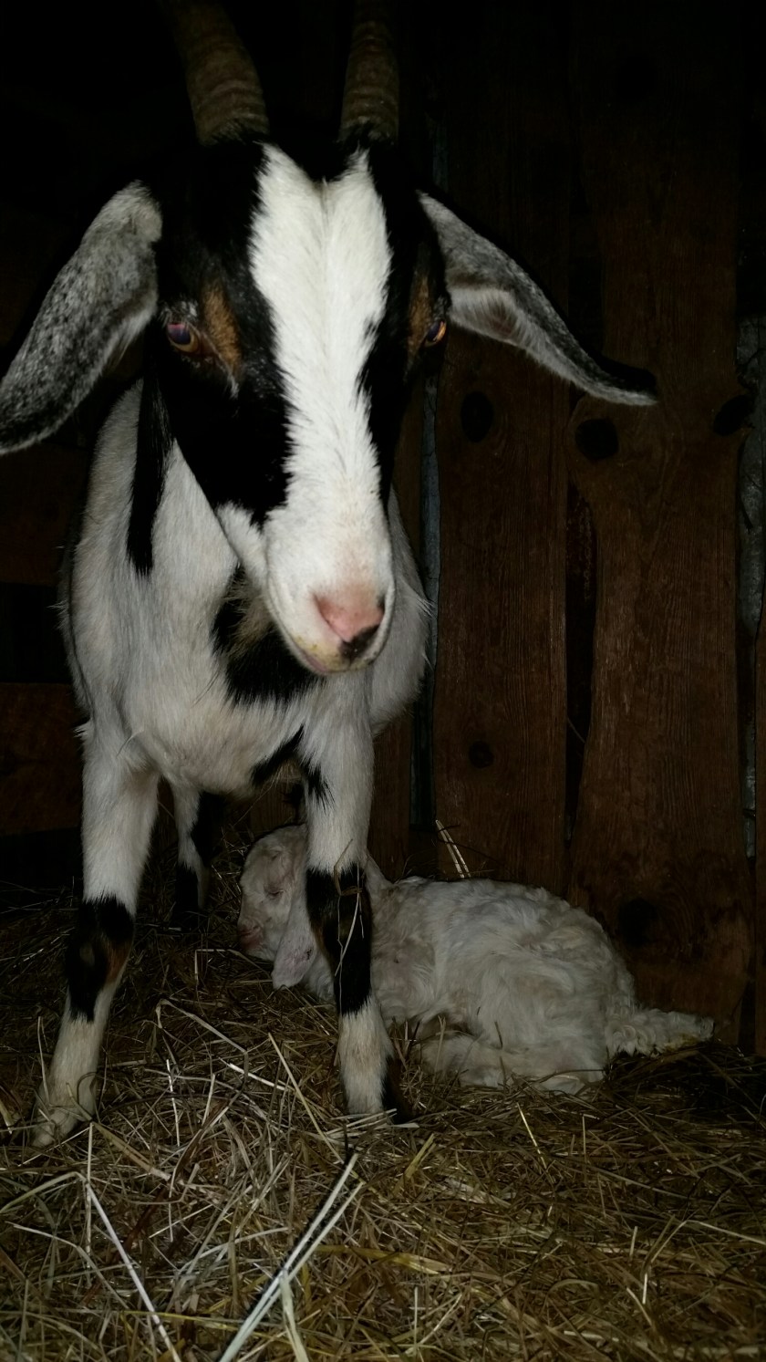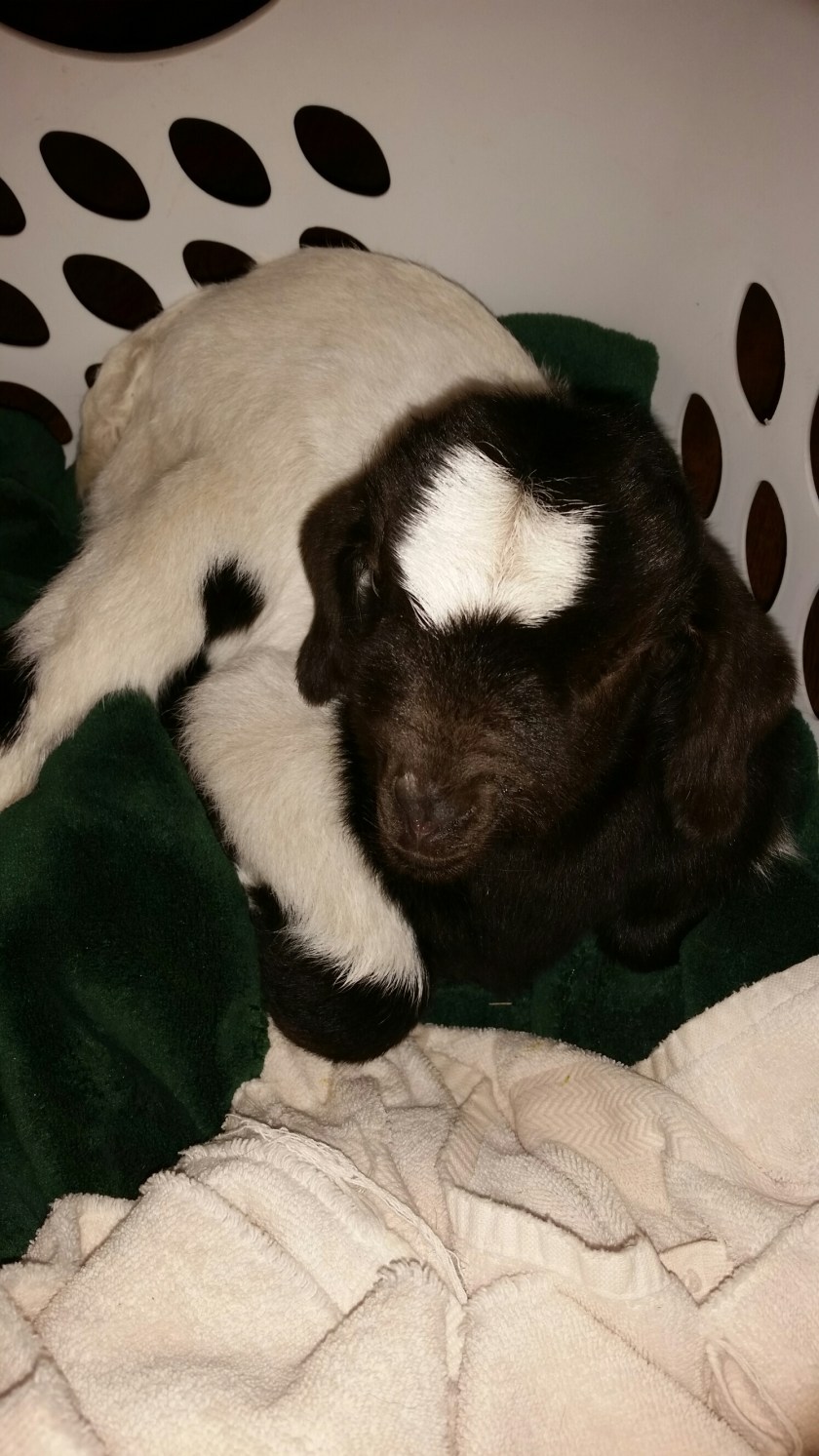 At lunch, I called to check on Bert and Jim said that he perked up at the he sound of the other goats and when he heard his mother screaming for him, he actually tottered to her and she stood for a few minutes to let him nurse. Wonders never cease. I arrived home after work to find Bert napping in the hay, snuggled to his brother Ernie. When Julie Andrews spotted me, they stood up and started nursing again. He’s still a little wobbly than the others, so we brought him inside to sleep in a laundry basket for another night while his lungs clear. He won’t take a bottle, so we tube fed him again late tonight and he’s sleeping in the laundry basket. He’s making huge strides and his eyes are clear, his coat is soft and his breathing has normalized.