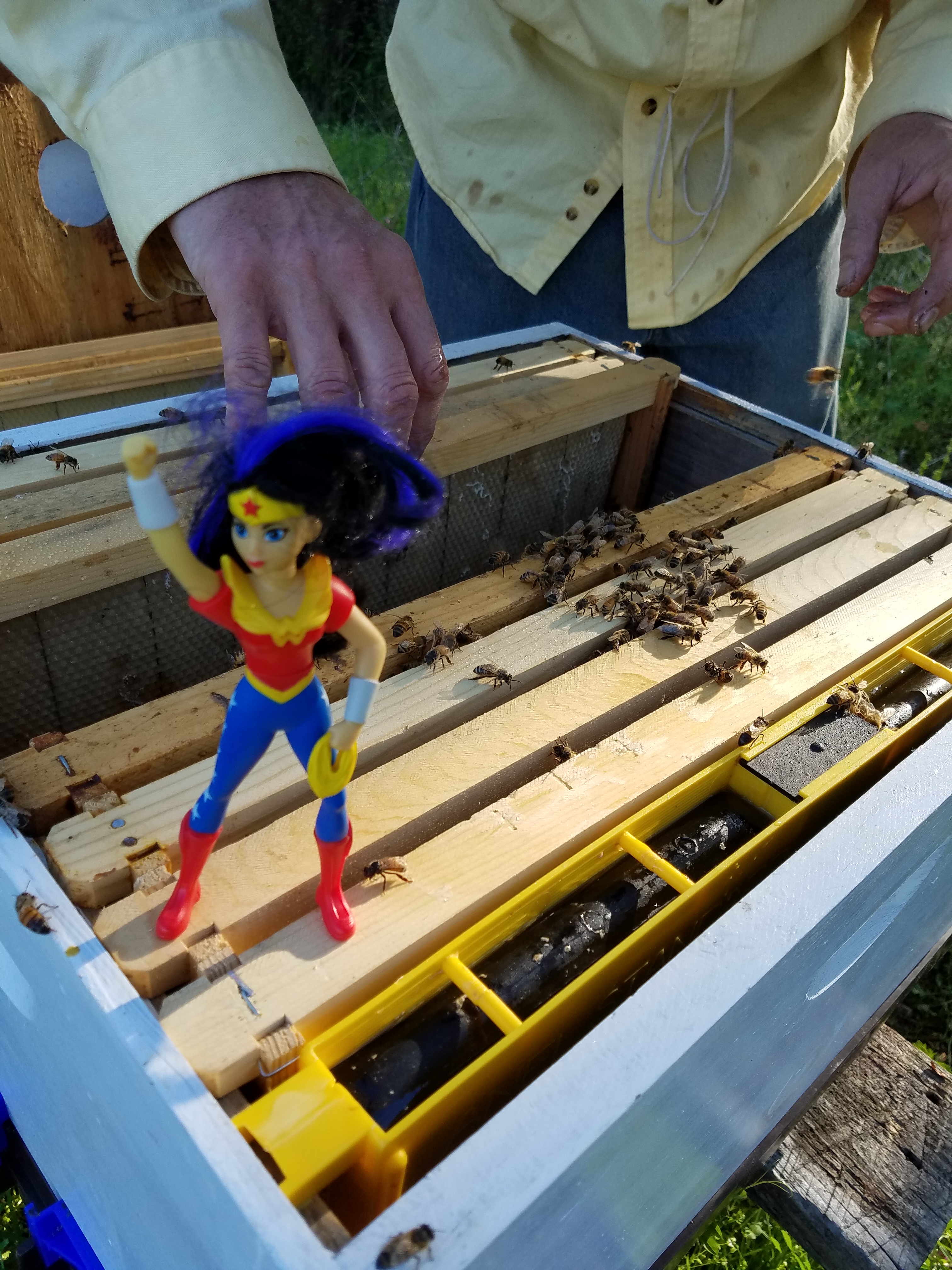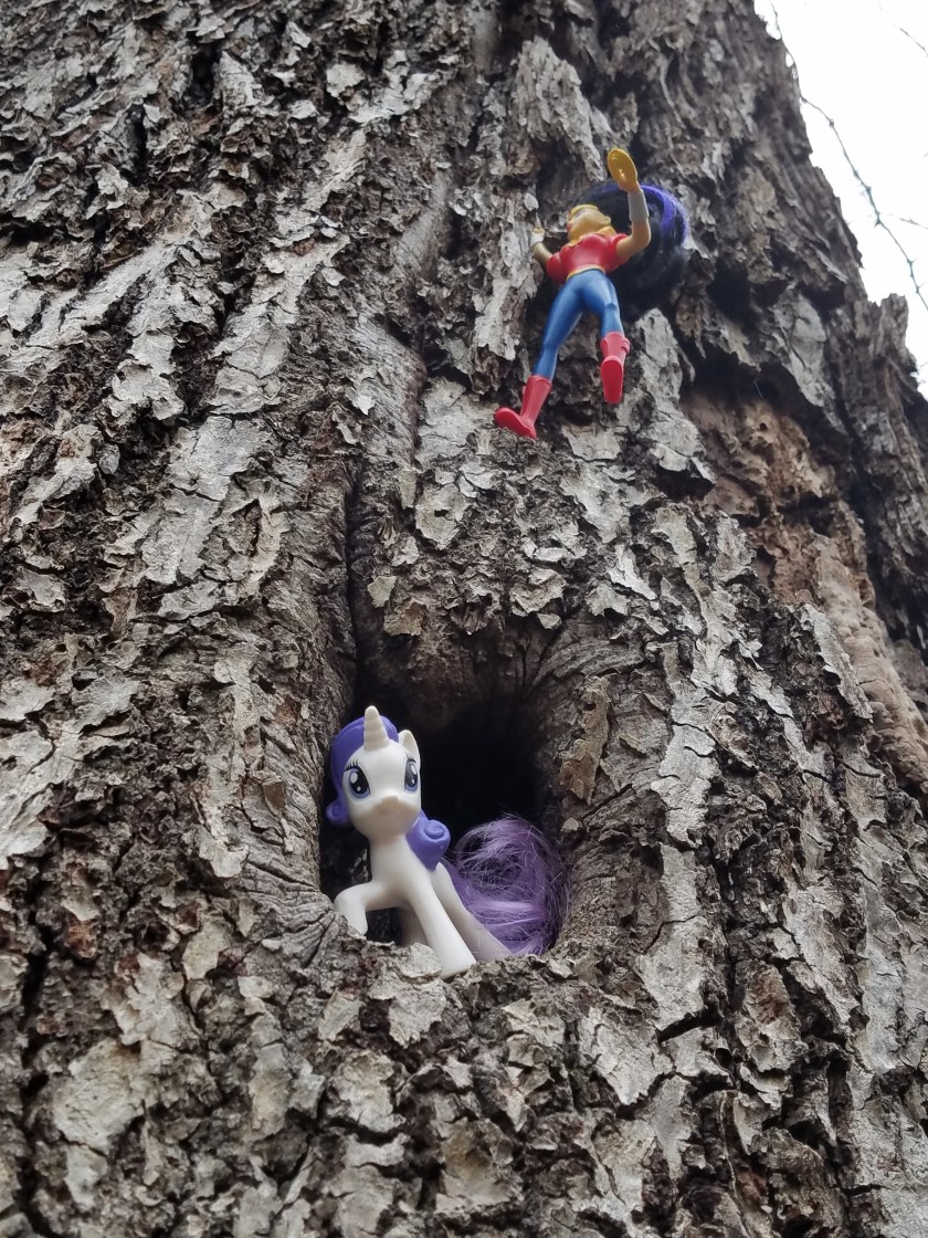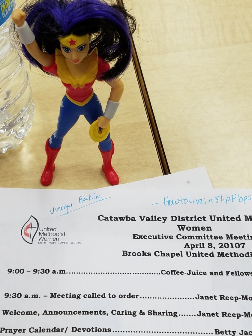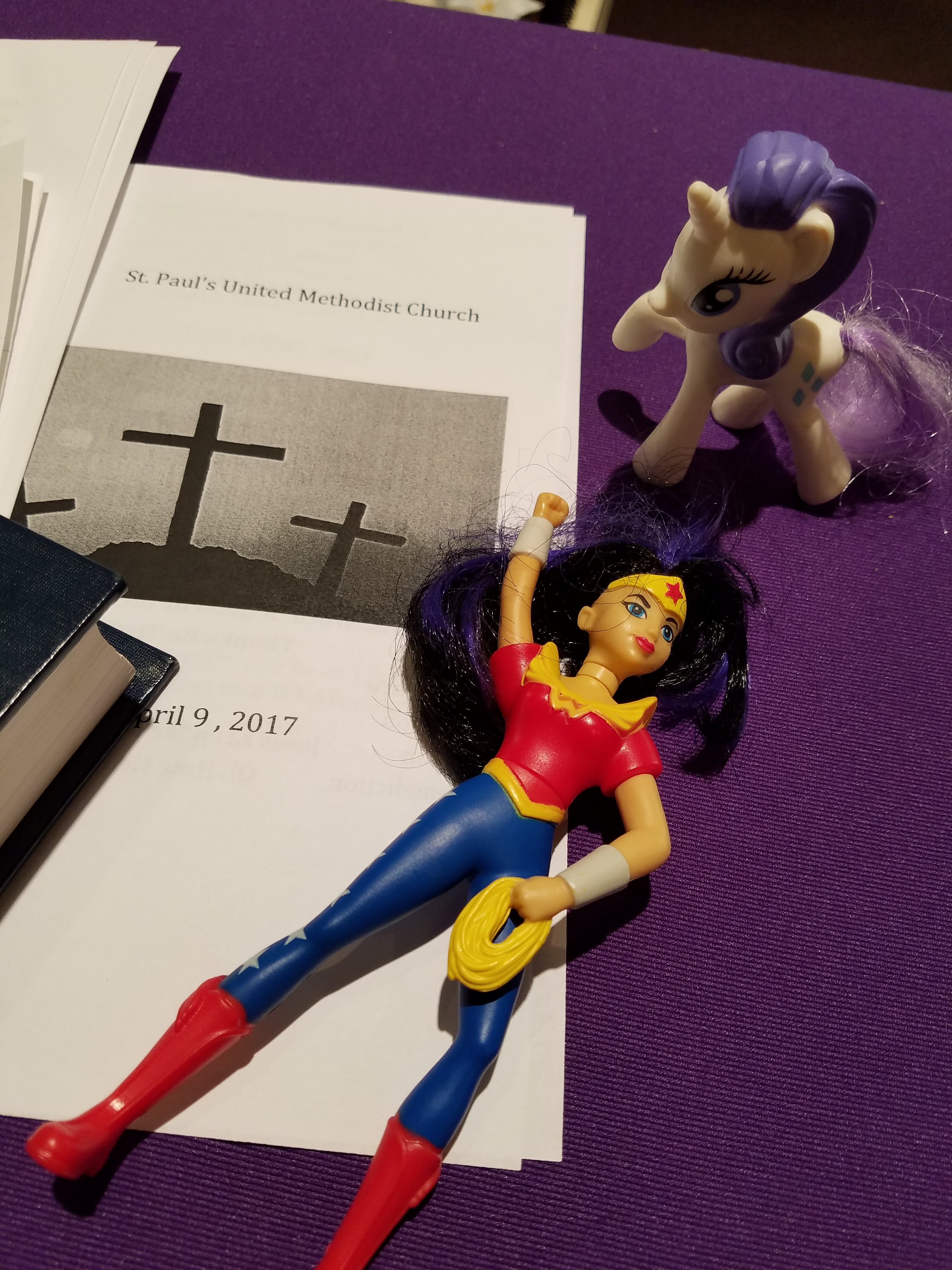 Ali wanted me to have a toy in case I got bored. The past few weeks have been far from boring.  Between hospital visits, healthcare navigation, work, farm life, new baby goats, a car accident, my own trip to the emergency room, and a few UMW presentations and meetings, life has been topsy-turvy.  In the midst of it all, Wonder Woman (#WWMLP) and My Little Pony have adventured into the world.  They’ve been to my office, walked on the nature trail, saved a cat-toy from peril, helped install new packages of honeybees, helped me with a sermon, and they were in my backpack when I was in a multiple-car accident on my way to work.
