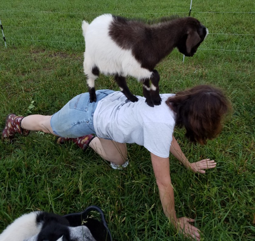 In the pasture, I knelt to pet Bert and he climbed on my back. So, this is normal for me: something new and silly with my goats.  Jim laughed as I demonstrated balancing a goat in two yoga poses. Earlier, when I said that I do goat yoga, I meant that I stand in the pasture and do yoga while the goats and donkeys stare at me. This is a whole new expirament with a little goat who back in February was floppy, unwanted by his mother, had to be tube-fed 4 times per day, and slept in a laundry basket.