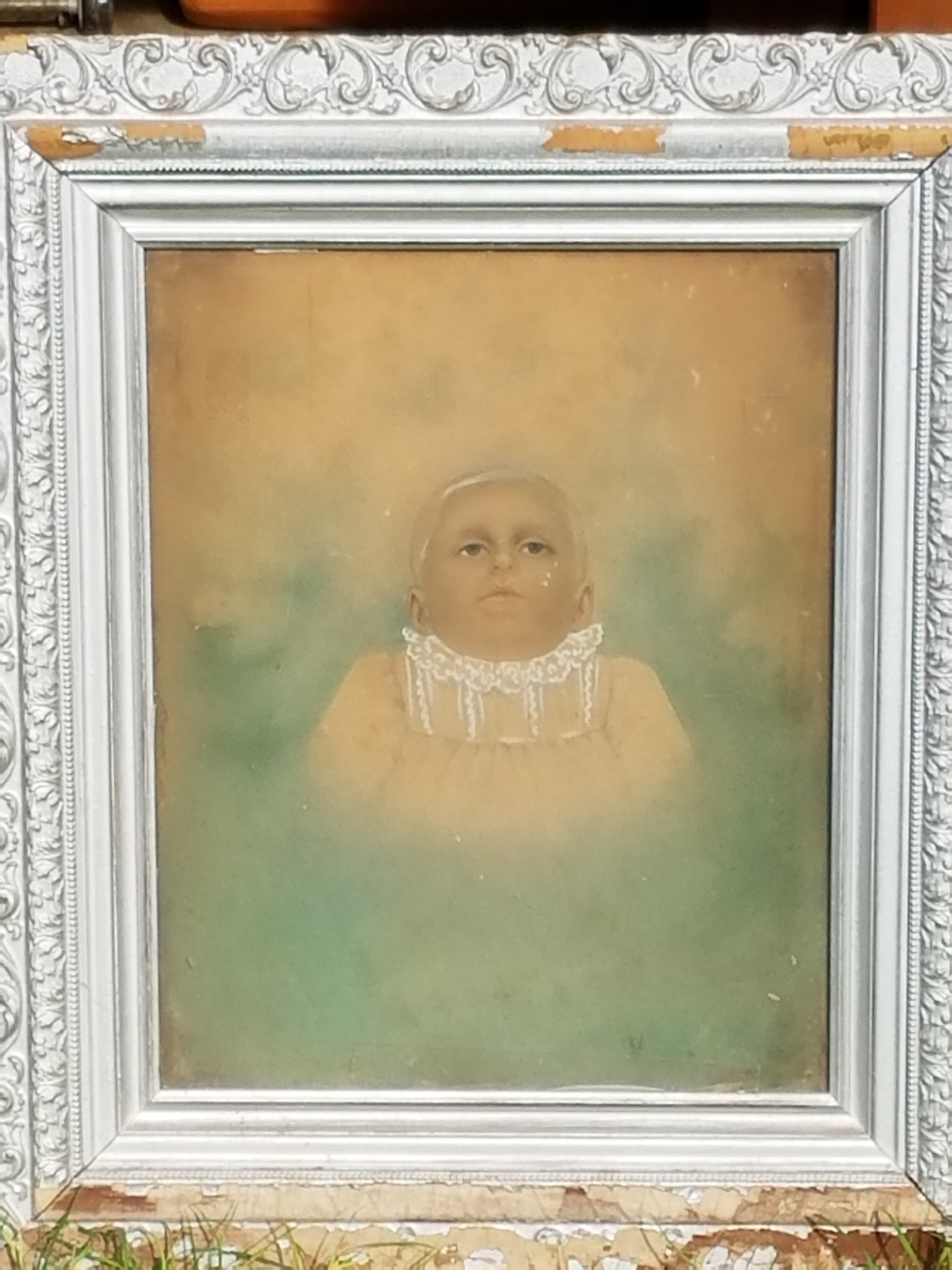 A few moments later, Aunt Anne brought a large ornate, guilded frame, approximately 20″ x 24″ from 1909 with Uncle Ollie’s cherub face. Painted with soft clouds in the background and exquisite details, his blue eyes seem to follow you. It takes a moment for someone to ask, “wait, is he dead in that photo?”
