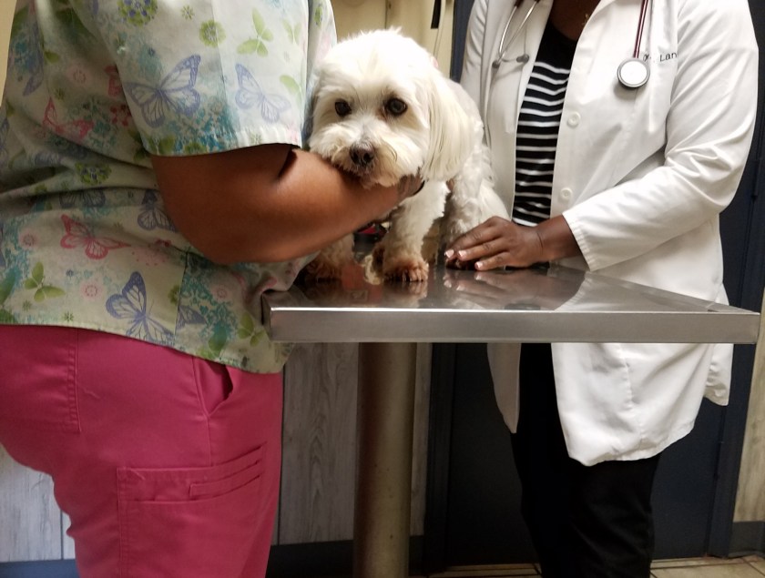 I had not planned to be sitting in the vet’s office first thing Monday morning. My schedule included a conference call,  process documentation, commuting and normal farm stuff in the afternoon. It was the 2nd night of a restless fluffy white dog who yelped in pain when being picked up, and a lack of appetite that drove me to change plans. I couldn’t call to inquire about an opening because of laryngitis; one more thing not on my calendar.