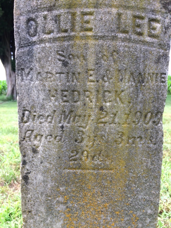 We walked to a section that I thought was too new, and turned right. Kelly methodically searched each headstone and said that he heard a voice say, “turn around” and asked, “who’s talking to me?” As I started back through the section dating from the late 1700s and early 1800s, Kelly spotted the small worn marker that I missed, and he circled around a second time. Third row from the trees, near the edge of a cornfield, he found the headstone of Ollie Lee Hedrick, oldest son of my great-grandparents. There it was, much smaller than I imagined, near two other infant markers. We began to feel a great sense of loss and peace at the same time. An almost delighted energy filled the area, and we said to no one in particular, “He’s not been forgotten.”